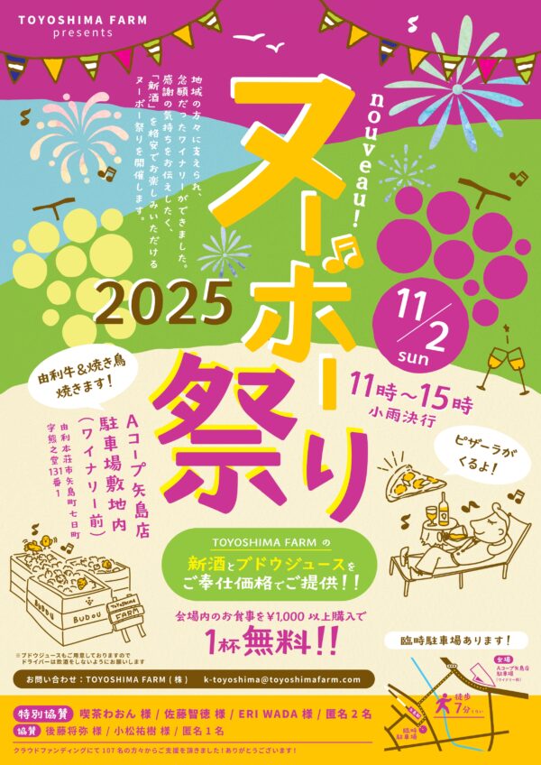 私のように資金も経験も歴史もない農園がワイナリーまでたどり着けたのは買い支えてくださった地元方々のおかげさまでございます。日頃の感謝の気持ちをお伝えするべく、ヌーボー祭りを企画しました。JR東日本秋田支社様、Aコープやしま店様、由利本荘市からのご協力を頂いて開催いたします。